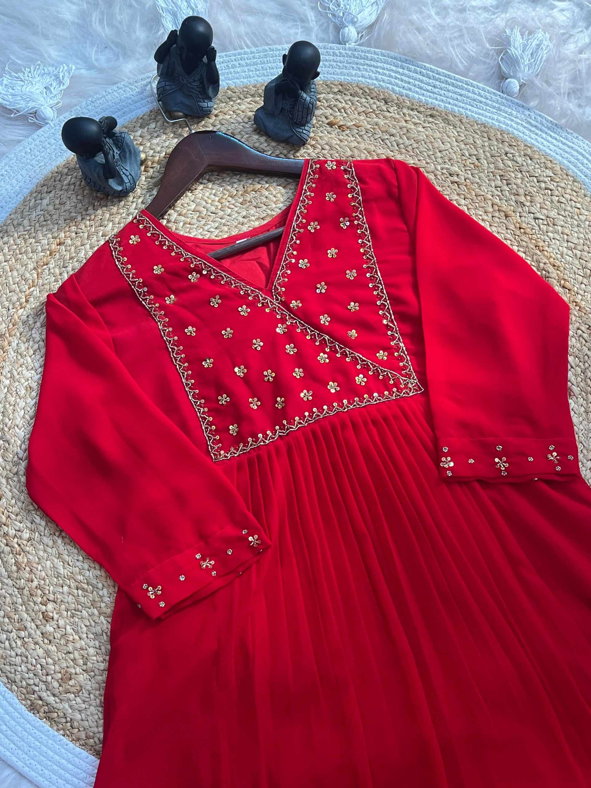 WM12 RED BLOOMING GEORGETTE BEAUTIFUL HANDWORK KURTI